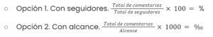 El engagement rate es la relación entre las interacciones y el número de seguidores o el alcance. Unos datos altos indican que el contenido resulta atractivo y relevante para la audiencia de tu empresa. Se trata de un % en caso de calcularlo con seguidores, y de un ‰, si se hace con el alcance, siendo el número de interacciones por cada 100 seguidores o 1000 usuarios alcanzados. Estas son las dos maneras de calcularlo: