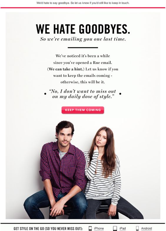 De esta manera también le harás ver que quieres crear una comunidad, que te interesa que tus contactos sean de calidad y que no quieres tenerlo en tu base de datos porque sí. Lo ideal es que también aportes un sentimiento de urgencia. Algo así como «Si no pulsas aquí daremos de baja tu suscripción«. Esto llevará a muchos de ellos a volver a abrir los mensajes de tus campañas.