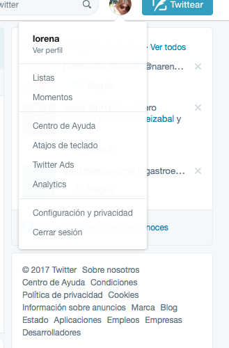 Ni descargas de apps ni caminos rebuscados. Para acceder a Twitter Analytics tan solo tendrás que iniciar sesión con tu cuenta. Una vez dentro, como puedes ver en la imagen, no tendrás más que pulsar en la pestaña de tu perfil y escoger «Analytics«.