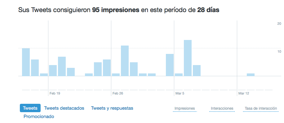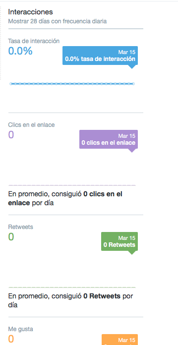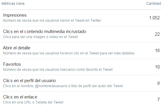 Junto al listado de los tweets, en la parte derecha podrás encontrar esta tabla de interacciones. Como puedes ver en la imagen, en ella podrás encontrar la siguiente información: