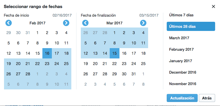 Aun así, puedes adaptarlo al periodo de tiempo que más te interese pulsando en la pestaña «Últimos 28 días«. En ella encontrarás un calendario como el que te mostramos para que personalices cada cuánto tiempo te interesa recoger los informes.