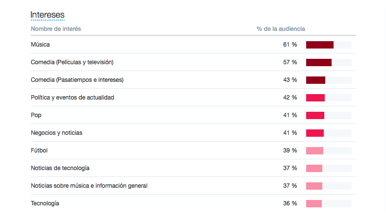 Justo bajo el gráfico encontrarás una lista como la de la imagen. En ella podrás conocer cuáles son los intereses de tu audiencia. De hecho, si mantienes el cursor sobre algún interés determinado podrás saber el número exacto de usuarios que está interesado en ese tema.