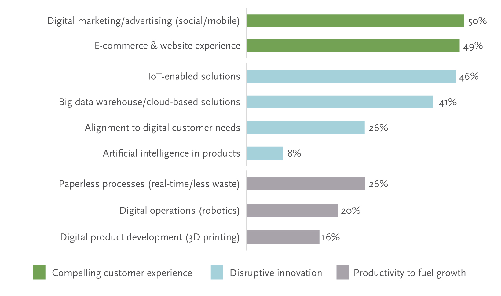 Sin embargo, dentro del sector industrial, las empresas tienen diferentes puntos de vista sobre lo que significa la tecnología digital para un negocio. De hecho, se resumen claramente en la infografía anterior. Aunque es importante destacar cómo se estructuran las categorías y en qué se cree que es importante centrarse en el momento de crear una estrategia de marketing digital para el sector industrial: