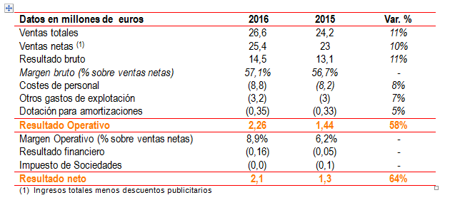 En Antevenio estamos de enhorabuena: cerramos el 2016 con un aumento del beneficio neto del 64% alcanzando los 2,1 millones de euros, y con un EBITDA de récord de 3 millones de euros. Las buenas noticias son fundamentalmente gracias al dinamismo de nuestros principales mercados -especialmente España y Latino-América y de nuestra área tecnológica, que desarrolla software para e-marketing y presta servicios asociados, cuyos ingresos se han disparado un 109% en este periodo.