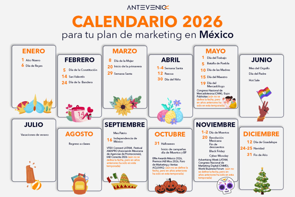 En este artículo te presentamos el Calendario de Marketing 2026, una lectura de las fechas clave en México acompañada de recomendaciones de activación y oportunidades donde Antevenio aporta valor a través de estrategias Mid & Low Funnel basadas en datos, audiencias cualificadas y modelos de CPL/CPC rentables.