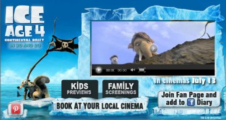 Sin embargo, SupersonicAds no solo ofrecía al anunciante la emisión del tráiler, sino que el banner tenía 4 llamadas a la acción que permitían: crear un evento en Facebook anunciando el día del estreno de la película, hacerse fan de la página de Facebook del flm, contribuir a viralizar la información sobre Ice Age 4 en Pinterest y comprar entradas de cine.