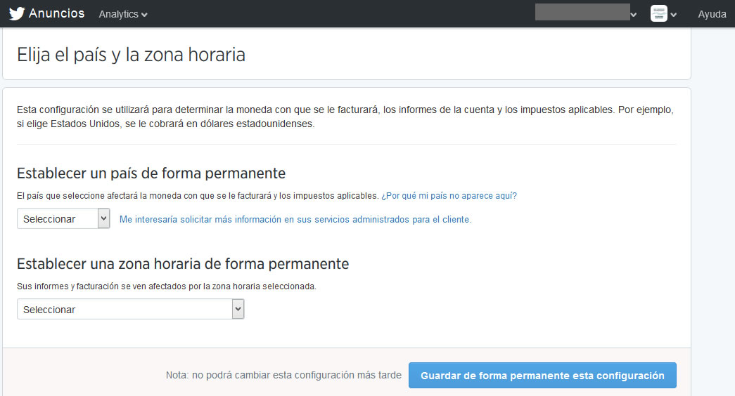 2.- Selecciona el país y la zona horaria: Lo primero que te solicita Twitter es que elijas tu país y zona horaria. Es importante configurarlo adecuadamente ya que esta configuración es permanente y no se podrá cambiar más adelante y se utiliza para determinar la divisa con la que pagarás tus anuncios en Twitter, los informes de la cuenta y los impuestos aplicables.