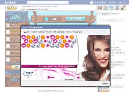 Una de las marcas que ha aprovechado la popularidad de los social games y se ha anunciado en los juegos de Facebook en UK ha sido Dove. Para obtener monedas virtuales, los jugones deben interactuar previamente con un “bubble shooter” en el que, cada vez que consiguen unir tres bolas, éstas explotan y aparecen unos rótulos con propiedades de los productos Dove. Una vez superado el juego, aparece un anuncio que hay que visionar para conseguir el crédito.