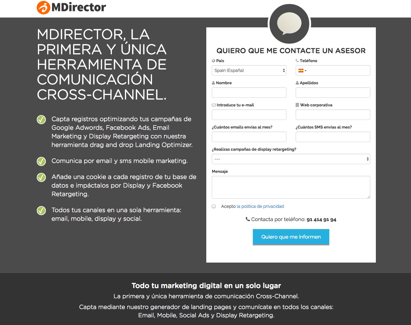 Si no tienes claros ciertos aspectos de tu landing page, puedes realizar Tests A/B con la herramienta Landing Optimizer de MDirector. Una aplicación creada para optimizar el proceso de realizar test A/B para landing pages, creando landings eficaces teniendo en cuenta los resultados de cada test. MDirector te ayudará a diseñar una página perfecta para que todos los elementos esenciales de una landing estén presentes,