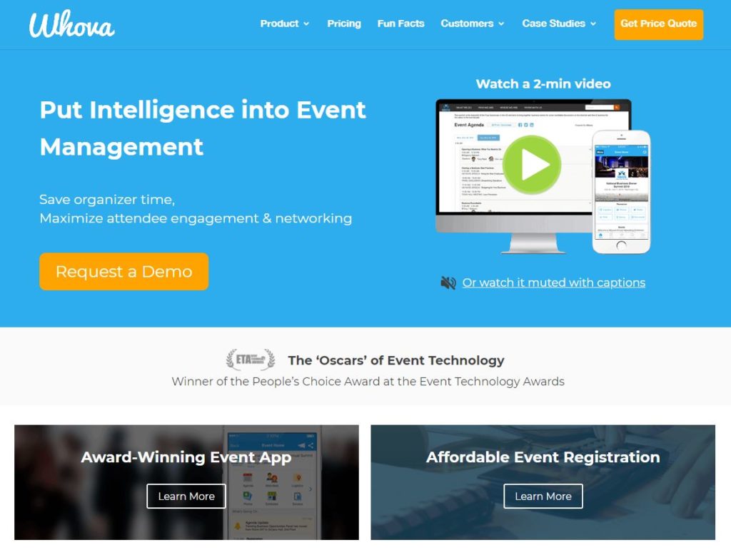 Whova permite la creación de sitios web de eventos y la gestión de la agenda, el registro de los asistentes o la generación de nombre y perfiles para los usuarios. Whova es una aplicación de eventos pionera en la funcionalidad de interacción y participación de los asistentes.