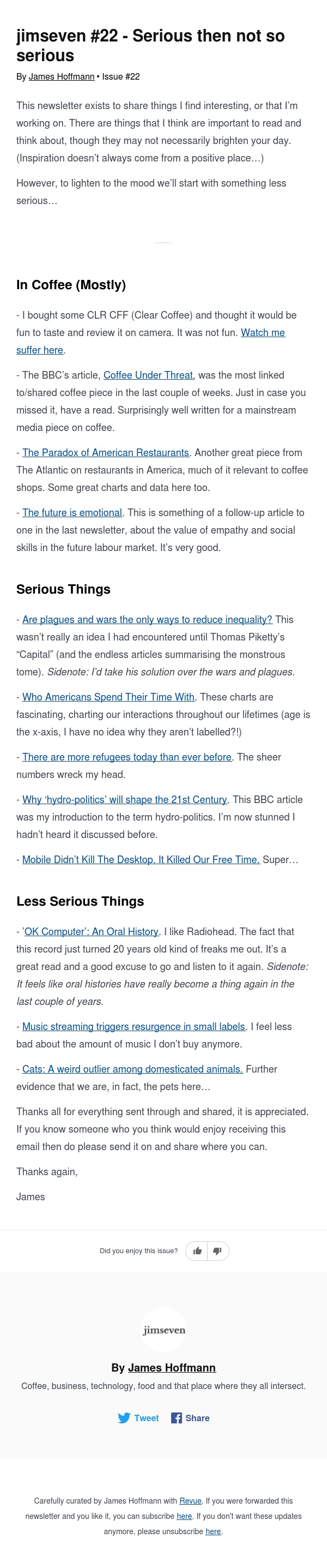 En este caso, James Hoffman ha acertado con esta estrategia. Semanalmente se prepara un boletín sobre el café que habla por sí solo.