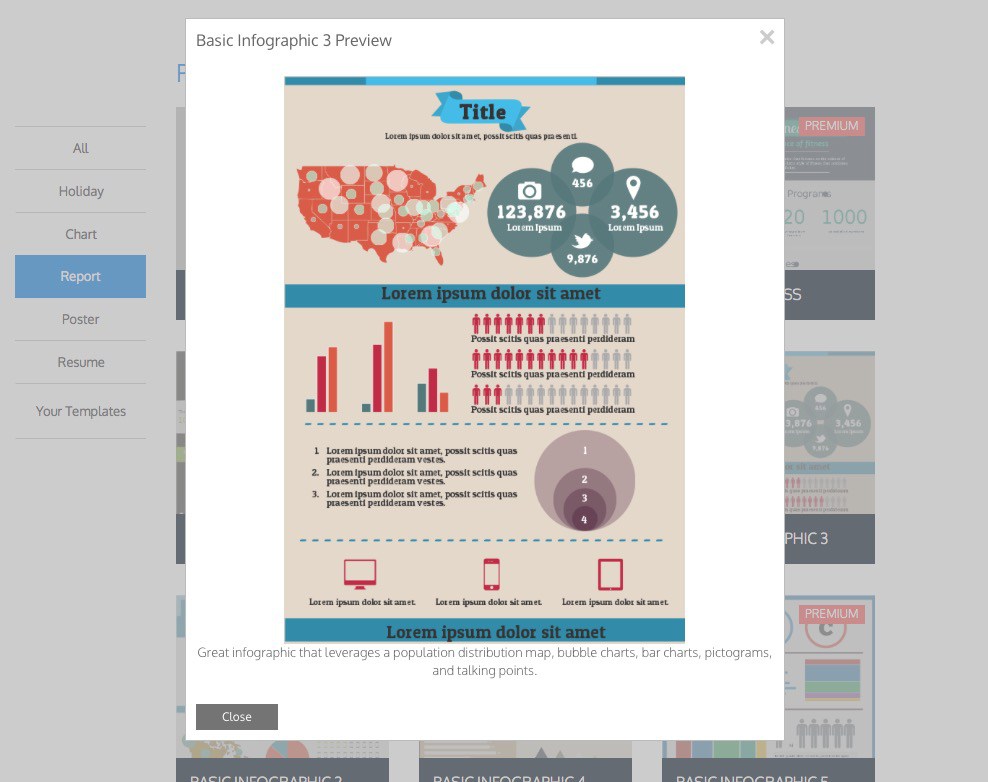 Venngage ti offre diversi templates gratuiti. Altri fanno parte della versione premium con un canone mensile. Per esempio ci sono alcune categorie limitate come la sezione CV. Ma altre hanno una buona varietà di elementi gratuiti come Charts e Report.